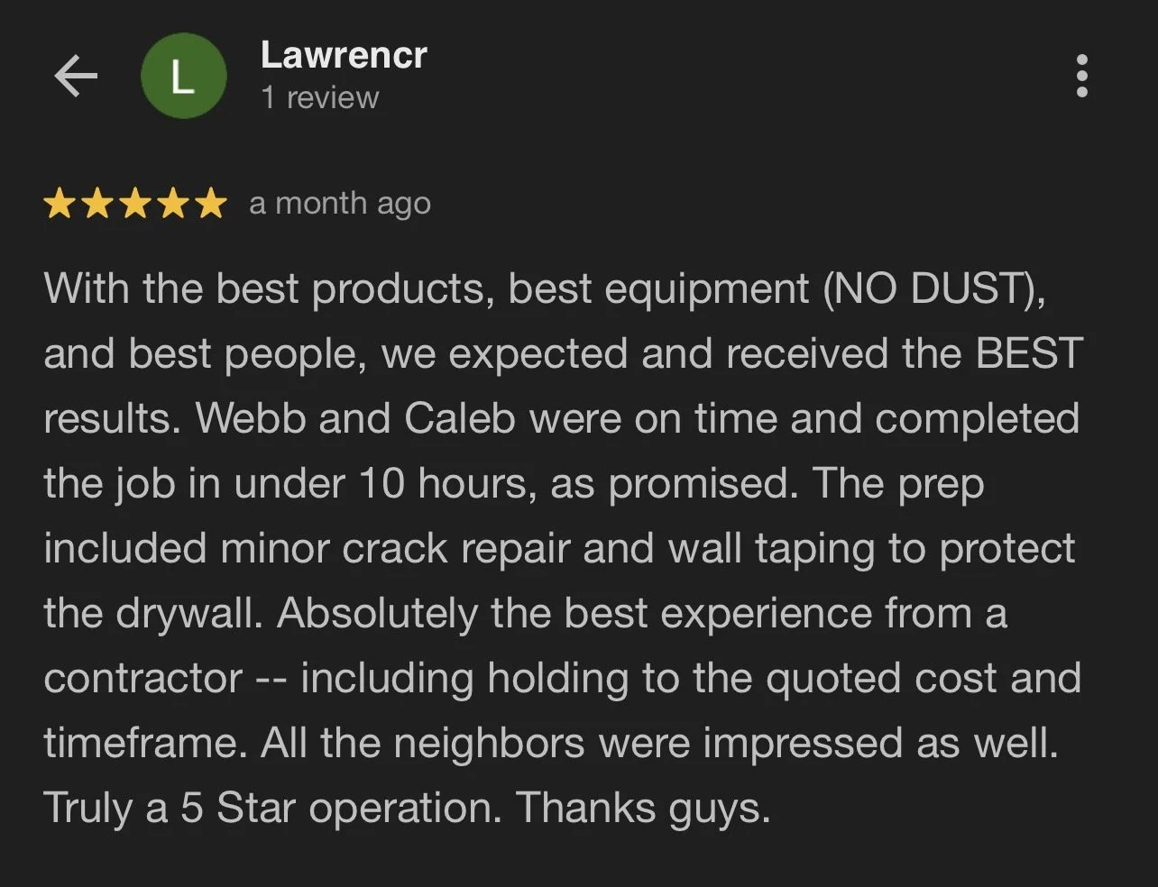 Screenshot of a 5-star customer review for a contractor named Lawrencr, praising their work, punctuality, and professionalism.
