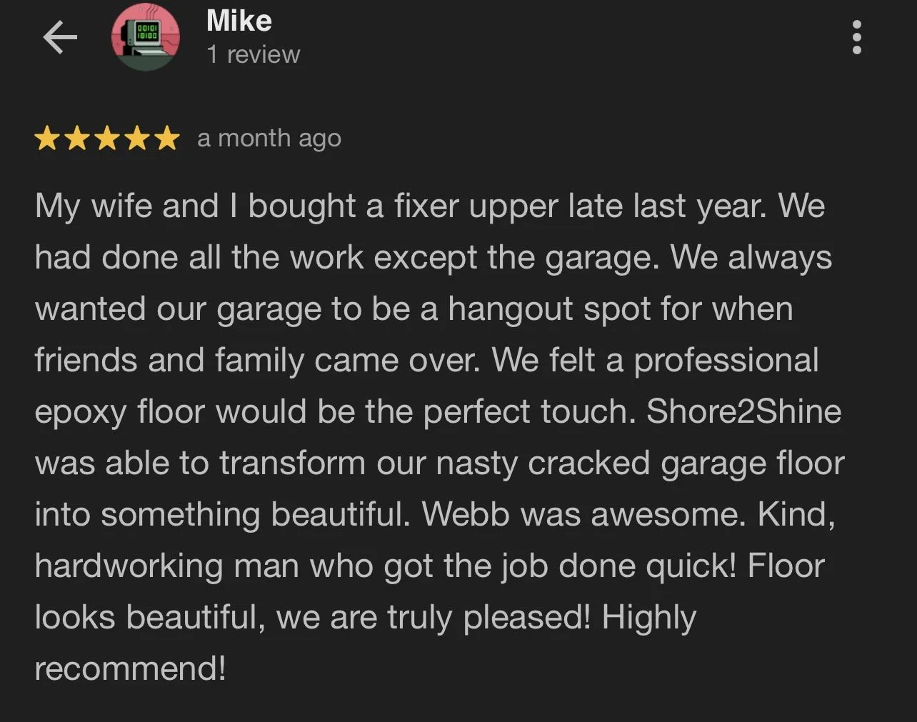 Google 5-star review from Mike praising Shore2Shine Epoxy Flooring Tampa for premium garage floor coating and polyaspartic finish that transformed his home garage into a sleek, durable space